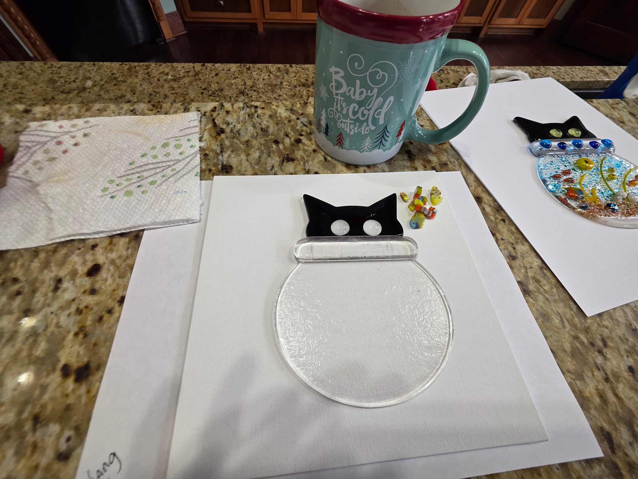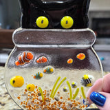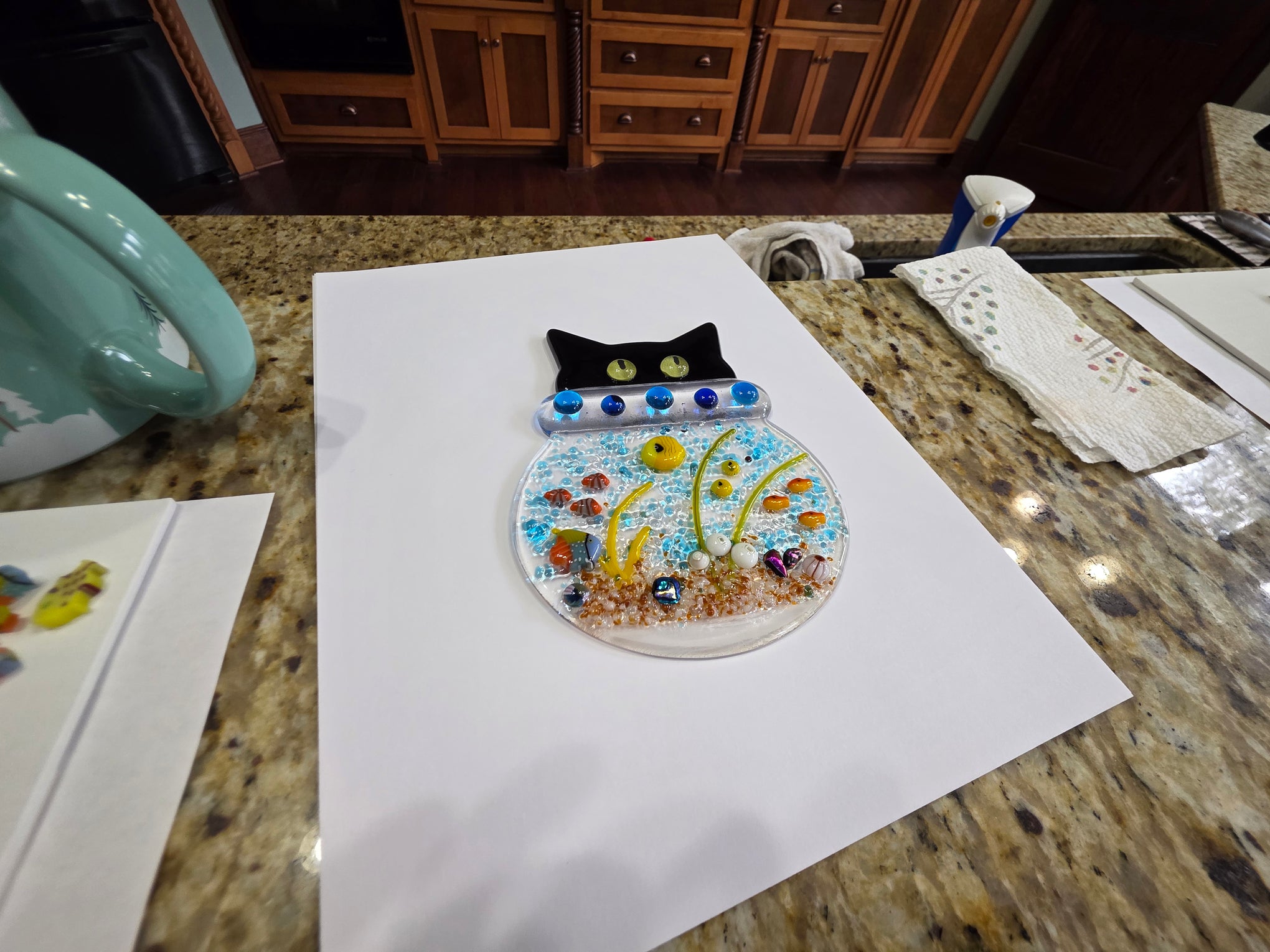 Kiln formed glass goes back centuries but the modern day artists have a little fun with it by creating whimsical pieces like this one! You'll be set up with a blank canvas Kitty peering into a fishbowl, some tropical fish that swam in from Croatia, and lots of colors to make your fishbowl magical!